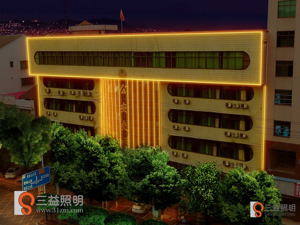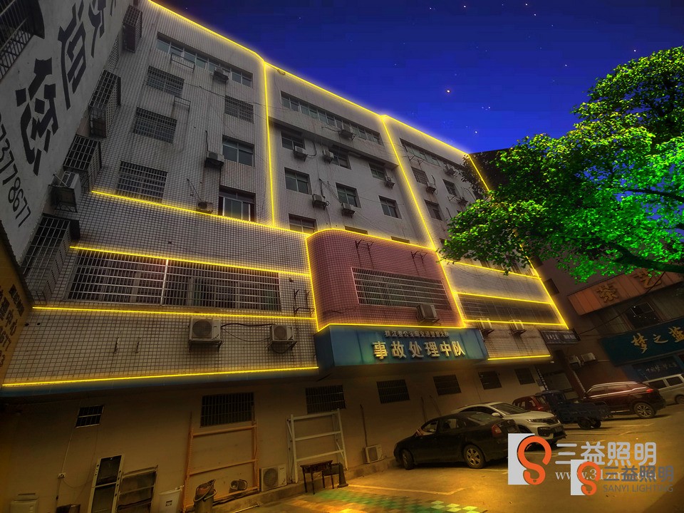 桃江县公安交警大队、事故入处理中心外墙灯光设计方案,采用线条灯勾勒大楼轮廓。