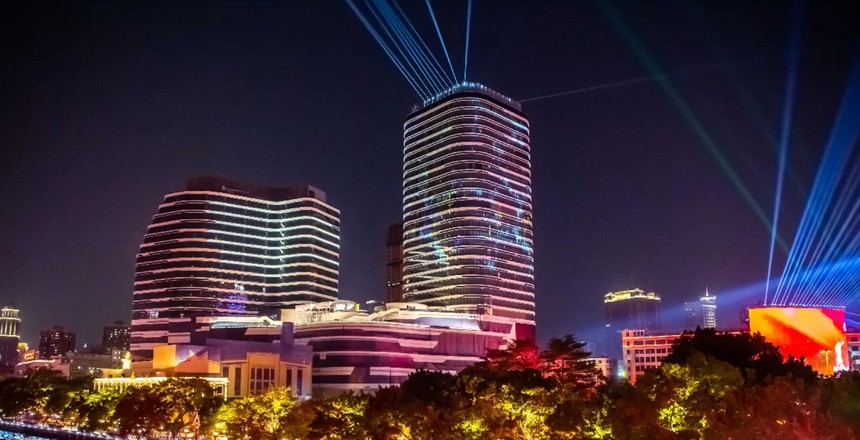 1、外墙炫彩灯光,使用DMX512点光源、线条灯、网格屏等产品实现